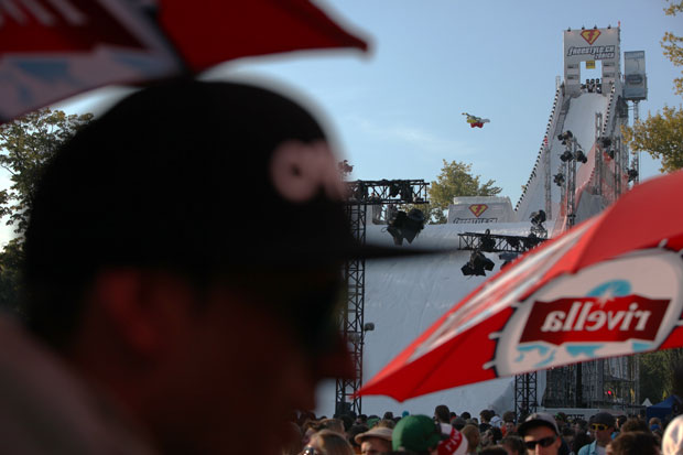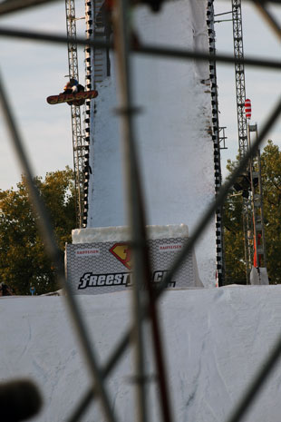 Für einen kurzen Moment des Schreckens sorgte Iouri Podladtchikov. Der Züricher knallte nach einem halben Rodeo mit voller Wucht auf den Rücken und blieb vorerst regungslos in der Landung liegen. Zum Glück war Iouri, der am Nachmittag noch mit dem Skateboard die Mini Mega Ramp bezwang, nach einigen Sekunden wieder auf den Beinen – wir hoffen dass es nichts ernstes ist und wünschen an dieser Stelle gute Besserung.