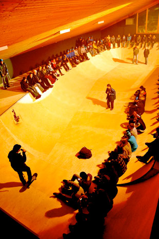 Neben der Schweizer Snowboard-, Skate- und Medienprominenz reisten natürlich auch wir vom MBM zum Eröffnungsevent am Freitag, den 3.12.2010 und kamen nach betreten der ehemaligen Tennishalle aus dem Staunen nicht mehr heraus. Als wir die Halle betraten fielen uns wortwörtlich die Kinnladen zum Boden, so groß war das Angebot. Europas erste Indoor-Freestyle-Halle bietet auf rund 1000 Quadratmetern 4 Riesentrampoline, einen Airtrack (12 m lange, aufblasbare Bodenturnbahn), eine Kletter-Boulder-Area, eine Skate-Microramp, eine mega-Miniramp mit Bowl, Corner und Extensions, eine Downbox und ein Rail und natürlich das Herzstück, die Schnitzelgrube. In diese kann man auf verschiedenen Wegen droppen, z.B. über die drei Big Air Absprünge, die sowohl für Snowboarder, Skater und BMXer geeignet sind oder um seine Pipe-Double Corks für die nächsten Olympischen Spiele zu üben über die Quarterpipe. Auf dieser Spielwiese werden sich sowohl Kids, die ihre ersten Freestyle Versuche unternehmen als auch Snowboard Pros wie Nicolas Müller, Sina Candrian, Markus “Mä” Keller, David Bertschinger-Karg und Jan Michaelis freuen, die allesamt zur Eröffnung in LAAX anwesend waren.