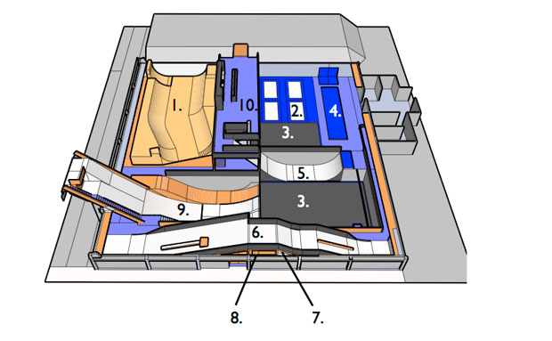 3. Foam Pit (Schnitzelgrube): Mit Schaumstoffstücken gefüllte Landegrube. Ermöglicht sicheres und risikoarmes lernen von Tricks und Sprüngen.