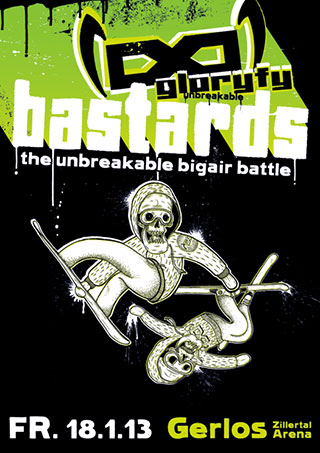 Auch heuer werden die insgesamt 32 geladenen Rider beim gloryfy BASTARDS unbreakable big air battle am 18.01.2013 – beim Kampf um insgesamt EUR 11.000,- Preisgeld – tief in die Trickkiste greifen. Eines der massivsten Setups Europas dient den Ridern dabei als Spielplatz: 25.000 Kubikmeter Schnee, ein 15 Meter hohes Obstacle mit 22 Meter Table und einer anschließenden Endsection bilden das anspruchsvolle Setup des einzigartigen Events in der Zillertal Arena. Dass dieses Spektakel für Jedermann bei freiem Eintritt zu bestaunen ist, setzt dem ganzen die Krone auf.