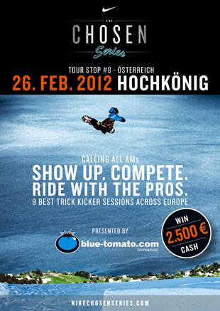 Diesen Sonntag (26.02) findet der nächste Tour Stop der Chosen Series im Blue Tomato Kings Park in Hochkönig, Österreich statt. Diesmal gibt es außer dem speziellen Kicker-Set mit Bonk Feature auch 2.500 € Preisgeld! Das Geld wird nach dem Prinzip CASH FOR TRICKS unter den Fahrern verteilt. Stompe einen guten Trick und kassiere Cash!