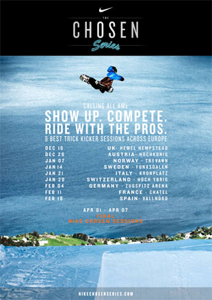 Mit den Chosen Series hat Nike die perfekte Plattform für Amateur-Snowboarder, die sich weiterentwickeln und gegen einige der besten Pros der Welt antreten möchten, geschaffen. Die Contest-Serie besteht aus neun Tourstopps quer durch Europa, wo die Amateure am Kicker ihr Können beweisen müssen.