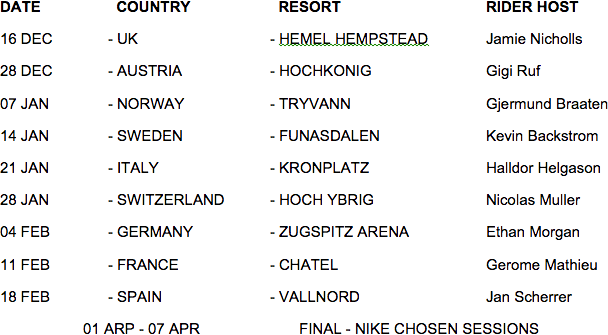 Jeder der Stopps wird von einem anderen Nike-Teamrider begleitet. Auf den besten Styler, den kreativsten Fahrer und den Best Female Rider warten jedes mal fette Preise. Doch nur der Best Overall Rider bekommt eines der begehrten Tickets für das große Tourfinale vom 1. bis 7. April 2012.