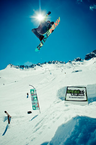 Idealer Schauplatz für SPRING IN THE PARK 2011 war der Terrain Park Zugspitze, der sich an der neuen Location am Wetterwandeck dank der fleißigen Shaper-Crew um Headshaper Karl Killer bis zuletzt in perfektem Zustand präsentierte und im Laufe der Osterwochen auch bekannte Snowboard-Pros wie David Benedek (GER), Ethan Morgan (GER), Marco Smolla (GER), Steve Gruber (AUT), Wolle Nyvelt (AUT), Christoph Weber-Thoresen (GER) und Christophe Schmidt (GER) sowie Local Hero Xaver Hoffmann (GER) anlockte.
