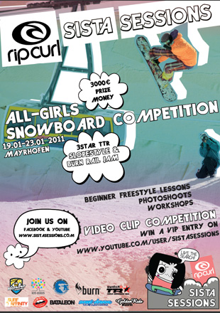 Vom 19. – 23. Januar finden in Mayrhofen die Rip Curl Sista Sessions statt. Die Teilnahme an dem TTR 3-Star-Contest bleibt den Ladies vorbehalten, es geht um 3.000 Euro Preisgeld und 400 TTR-Punkte. Ausserdem erhält die vielversprechendste, nicht gesponsorte Fahrerin einen einjährigen Deal mit Rip Curl. Neben dem Contest wird mit Fotoshootings, einer Chillout-Area und vielem mehr auch für die Zuschauer einiges geboten.
