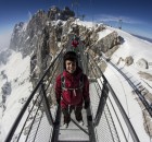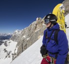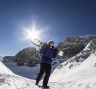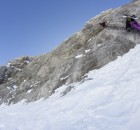 Der nächste Tag begann wieder um 8 Uhr. An diesem Tag stand eine längere Tour im Gelände auf dem Plan. Dafür bekamen wir einen Klettergurt und ein Klettersteigset. Denn der Hang, den wir fahren wollten, war nicht so einfach zu erreichen. Wir mussten die Snowboards auf den Rücken schnallen, eine etwa 30m hohe Leiter hochklettern und durch einen Tunnel auf die andere Seite des Felsens gehen. Dort befand sich der Einstieg in den Hang.