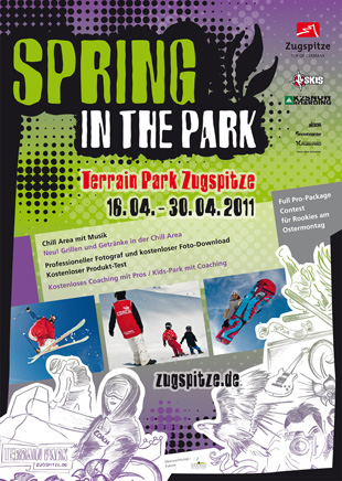Wenn im Frühjahr im Tal die Osterglocken sprießen, startet die Snowboardsaison auf der Zugspitze noch einmal richtig durch: Dann steigt auf Deutschlands höchstem Berg jedes Jahr das legendäre Freestyle-Camp Spring in the Park. Diese Saison findet das zweiwöchige Event im neu gestalteten Terrain Park Zugspitze statt. Vom 16. bis 30. April 2011 bietet Spring in the Parkwährend der Osterferien bereits zum sechsten Mal das volle Programm für Parkrider und alle, die es werden wollen!