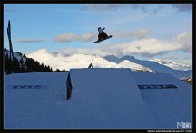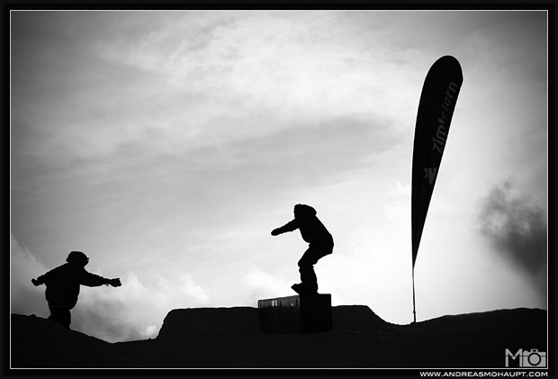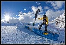 Aber der Snowpark in Arosa konnte sich trotz allem sehen lassen. Rechts der Superpipe wurde in den Parkour eingedropped. Nach einem langen Inrun warteten zahlreiche durchdachte Obstacles (Straightbox, Elephantbox, Bonk Barrel, Downbox, StepUp Roller (15 m Table), Double Kicker mit 10 u. 8m Table), Downrail, Kinked Box, Double Kicker mit 8 u. 6m Table). Alle Rider hatten sichtlich Spaß diesen Park zu rocken…