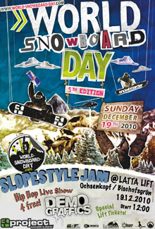 Somit startet am 19.12.2010 das World Snowboard Day Event um 12:00 Uhr am Latta Lift – Ochsenkopf in Bischofsgrün. Beim diesjährigen „get together“ gibt es für Jedermann ein vergünstigtes Liftticket und für Könner einen Slopestyle Jam mit tollen Sachpreisen. Als besonderes Special rundet die HipHop-Combo Demograffics mit ihrem Auftritt die Veranstaltung ab. Also, Boards wachsen und vorbei kommen!