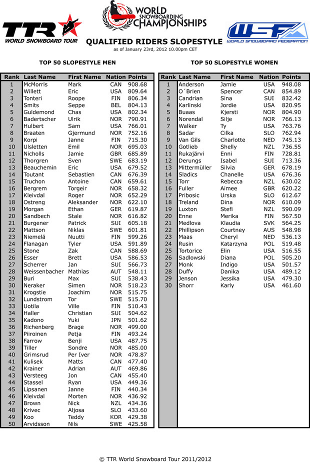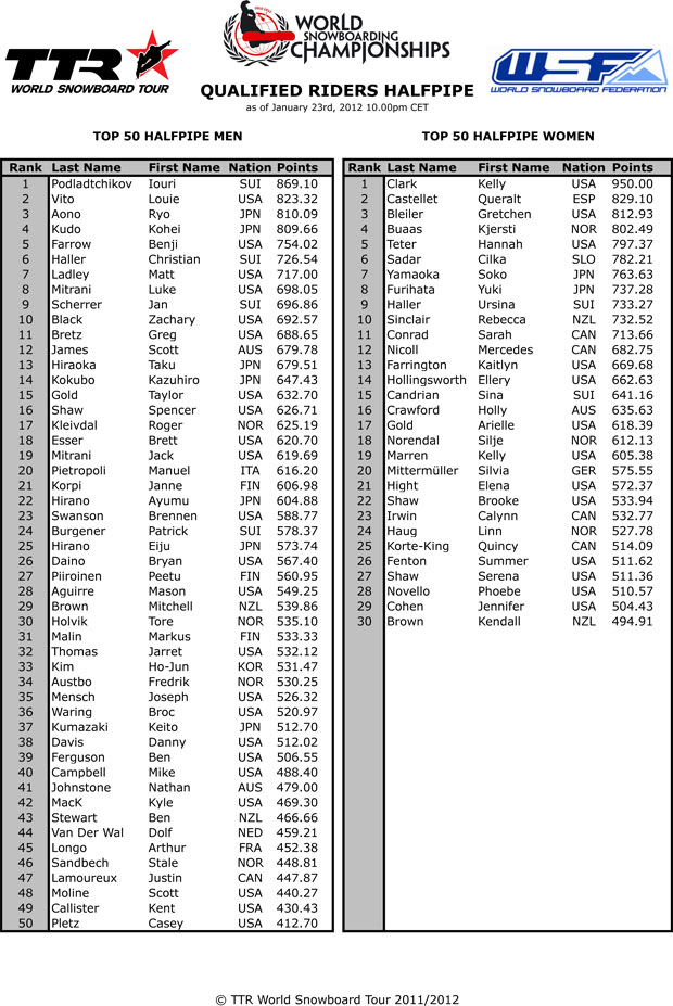 Freudige Nachrichten von der TTR: Die Starterliste für die Snowboard-Weltmeisterschaften in Oslo steht fest. In der Halfpipe führt Iouri Podladtchikov (SUI) das Qualifikations-Ranking vor Louie Vito (USA) und Aono Ryo (JPN) an. Bei den Ladies war Kelly Clark (USA) ihren beiden Verfolgerinnen Queralt Castellet (ESP) und Gretchen Bleiler (USA) haushoch überlegen. Einziger deutscher Starter in der Halfpipe ist Silli Mittermüller.