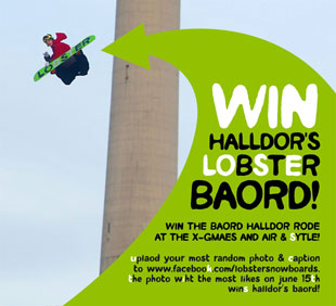 Schon alleine deshalb solltet ihr uch das hier gut durchlesen: Die beiden Isländer verlosen nämlich nun das Lobster-Board, das Haldor bei den diesjährigen X Games gefahren ist. Das Board ist – wie gesagt – noch ein echtes Unikat und obendrein noch von einem der besten Snowboardern der Welt “eingefahren”.