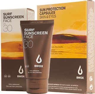 Die Swox Surf Sunscreen ist einer der ersten Sonnencremes, die speziell auf die Bedürfnissen von Surfern zugeschnitten wurde. Sie filter UVA- und UVB-Strahlung zuverlässig und schützt eure Haut dank Zusätzen von Zinkoxid und Titandioxid effektiv vor Sonnenlichtschäden.