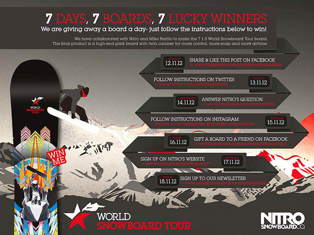 Nitro Snowboards und die World Snowboard Tour haben den Künstler Mike Parillo angeheuert, um eine streng limitierte Auflage des Nitro T 1.5 für sie zu designen. Sieben dieser Bretter stehen jetzt in einem einwöchigen Gewinnspiel für euch bereit. Wir sagen euch, wo und wann ihr eines der Bretter abstauben könnt: